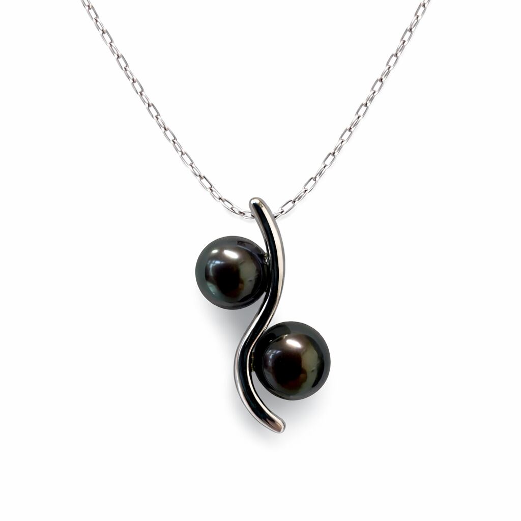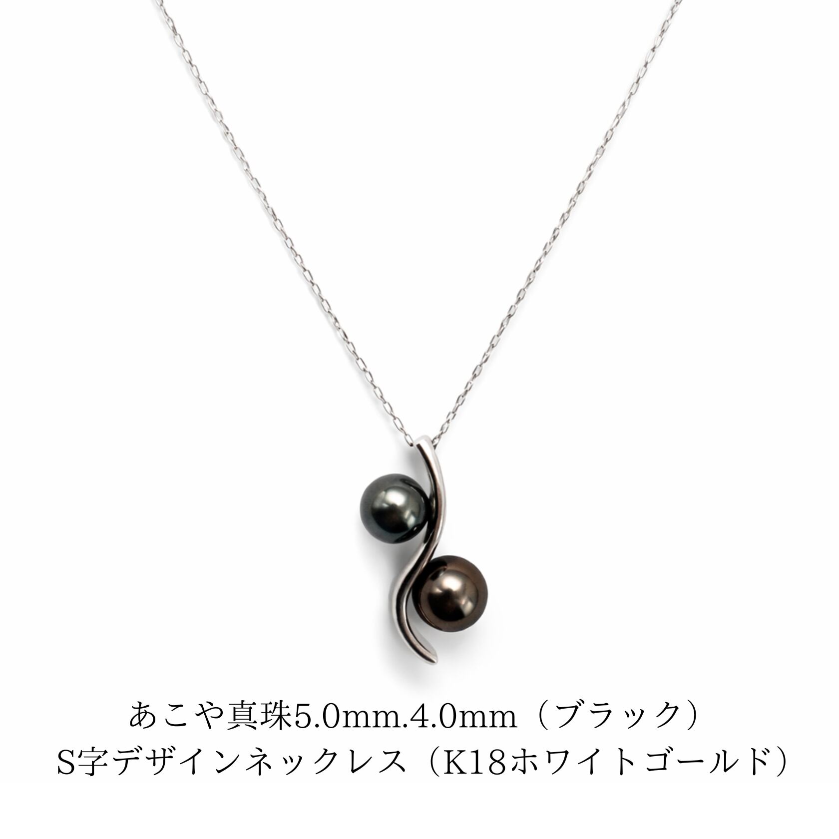 洗練された大人の魅力を纏う、ブラックあこや真珠のネックレス。4.0mmと5.0mmのサイズ違いのパールを、流れるような美しいS字ラインにあしらった、モダンで上品なデザインです。