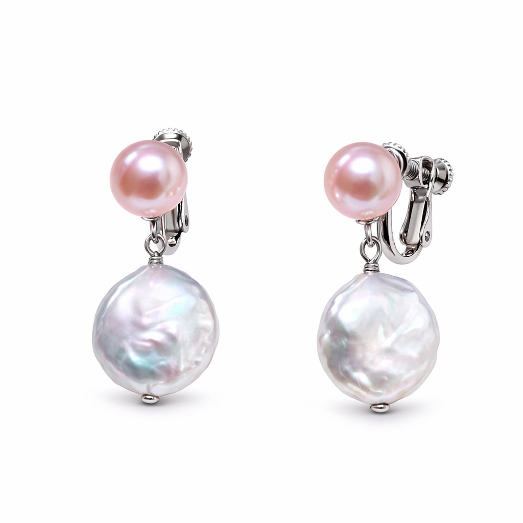 丸いパールの可憐さと、コイン型バロックパールの自然なフォルムが美しく揺れ、耳元にやわらかな光沢と奥行きを与えてくれます。