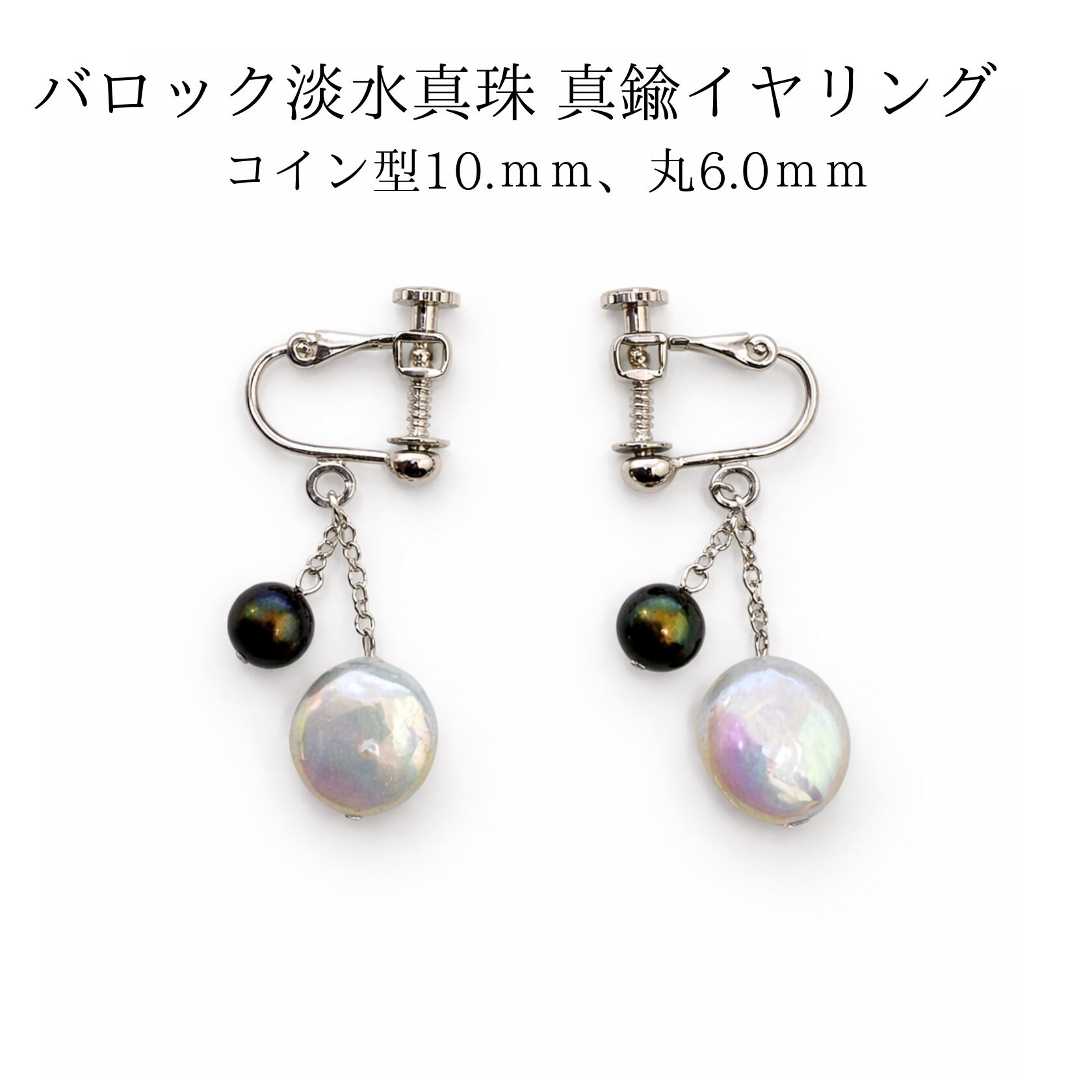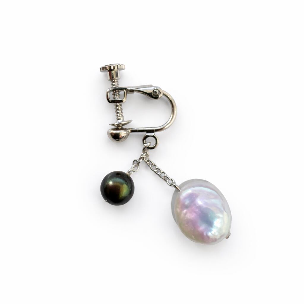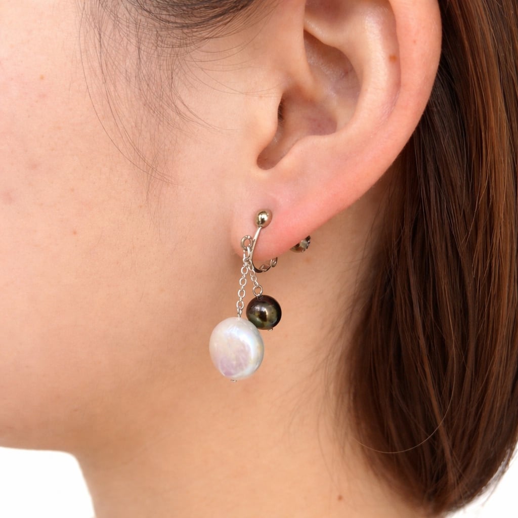 6mmのブラック淡水真珠と、10mmのコイン型ホワイト淡水真珠を組み合わせた、上品で存在感のあるデザインです。