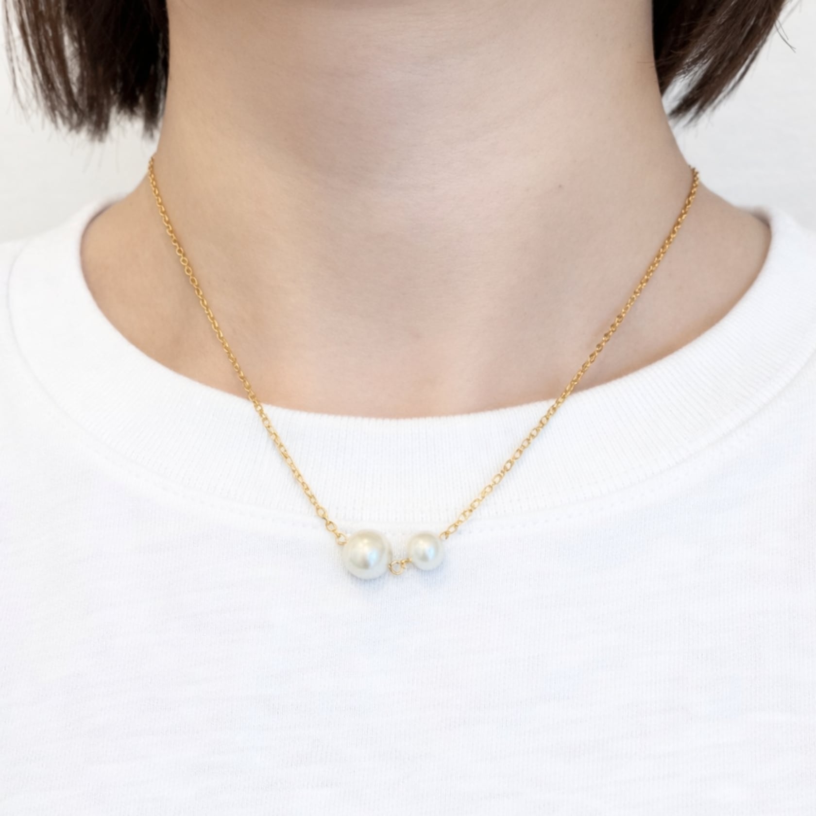 大小異なるパールが胸元に自然なリズムを生み、シンプルながらも印象的な仕上がりに。